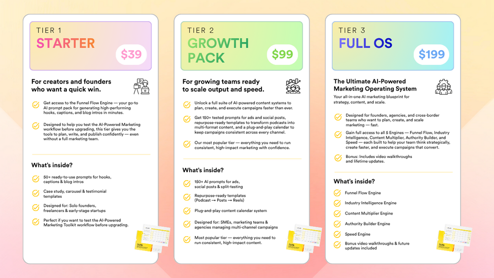 From chaos to clarity — this is your complete AI-Powered Marketing Toolkit designed to help founders, creators, and teams plan smarter, create faster, and scale with confidence. Whether you’re starting small, levelling up, or building a full creative ecosystem, there’s an Engine built for the stage you’re in.
